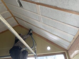 ブローイング工法にて断熱材の敷き込みを行いました。