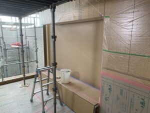 造作家具の設置が完了し珪藻土の下塗りを行いました。