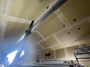 クロス貼りに先立ち、パテを使って壁天井を平滑にするための下地作業(下地材の繋ぎ目を埋める、ビス穴を埋める)を行いました。