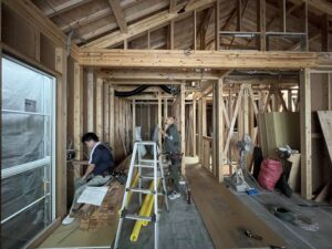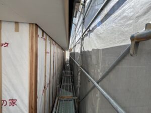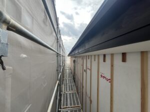 軒天井に塗装下地となるケイカル板(不燃材)貼りを行いました。