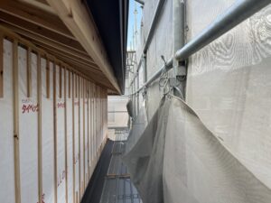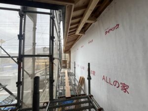胴縁は透湿防水シート(ALLと表記のある白いシート)の上に縦方向に取り付けている薄い木材のことです。