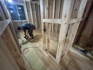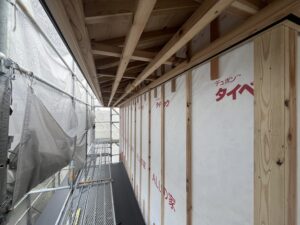 外壁に透湿防水シート(タイベック)貼りを行いました。