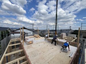 クレーンを利用し胴差し(2階の床の高さで建物の周りをぐるりと巡る横架材)、
