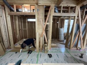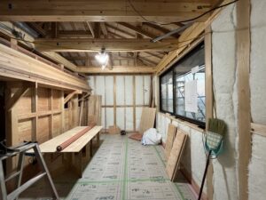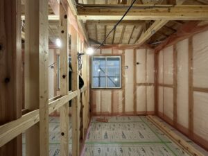 壁の気密シート(ピンク色の透明シート)貼りを行いました。