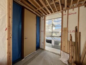 扉が茶色く見えているのは養生シートとなります。またレバーハンドルとシリンダーは工事用のものを使用しており、お引渡し前に新品のものへ交換致します