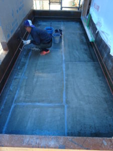 外壁のKラス貼りが完了し軽量モルタルの下塗りを行なっています。