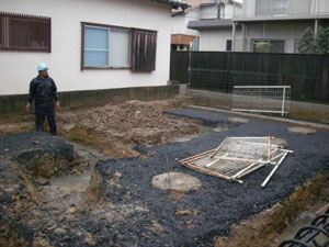 砕石の上に防湿シート敷きと捨てコンクリートを打って地面からの湿気を遮断し、その上に基礎を作ります。