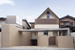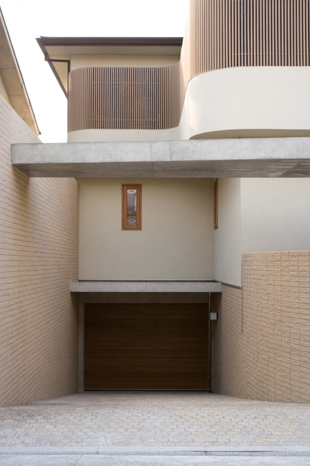 地下駐車場へ続くスロープ。木製の電動オーバースライダーの先には、奥に長い敷地を活かし、ゆったりと数台の車が停められる駐車場を確保している。Rに張り出したバルコニーとコンクリート打ち放しの直線的な庇の対比が印象的。
