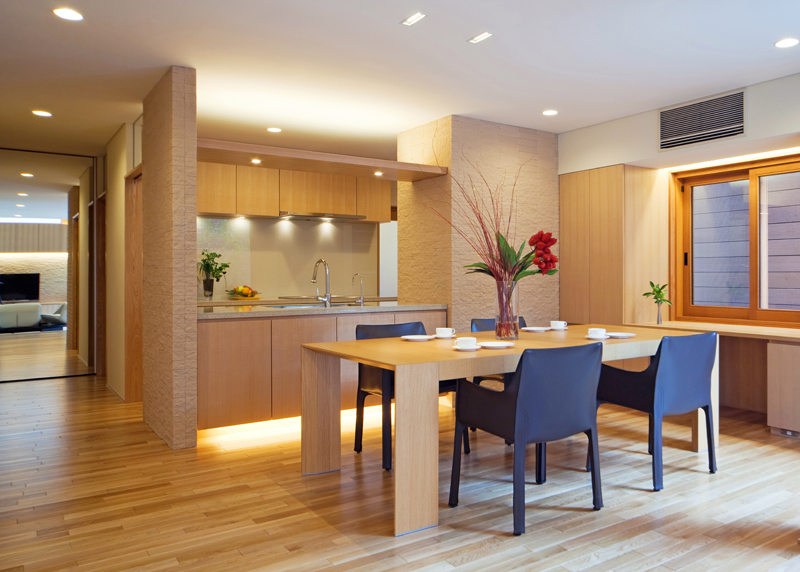 キッチンからリビングダイニングを望む。LDKのどこからでも2ヶ所の植え込みが眺められるように設計されている。随所に造り付けられているALLオリジナル家具には間接照明が仕込まれており、上質な空間を際立たせている。