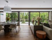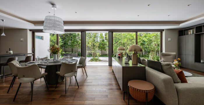 庭に面した大開口サッシが連続する、伸びやかなLDK空間。照明が室内の輪郭をやわらかく際立たせ、昼夜で異なる表情を生み出す。リビングからダイニング、キッチンへと視線と動線が自然につながり、外部の緑景を取り込みながら、開放性と落ち着きを両立させている。