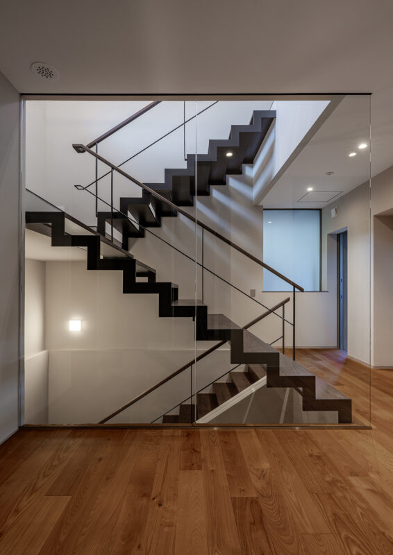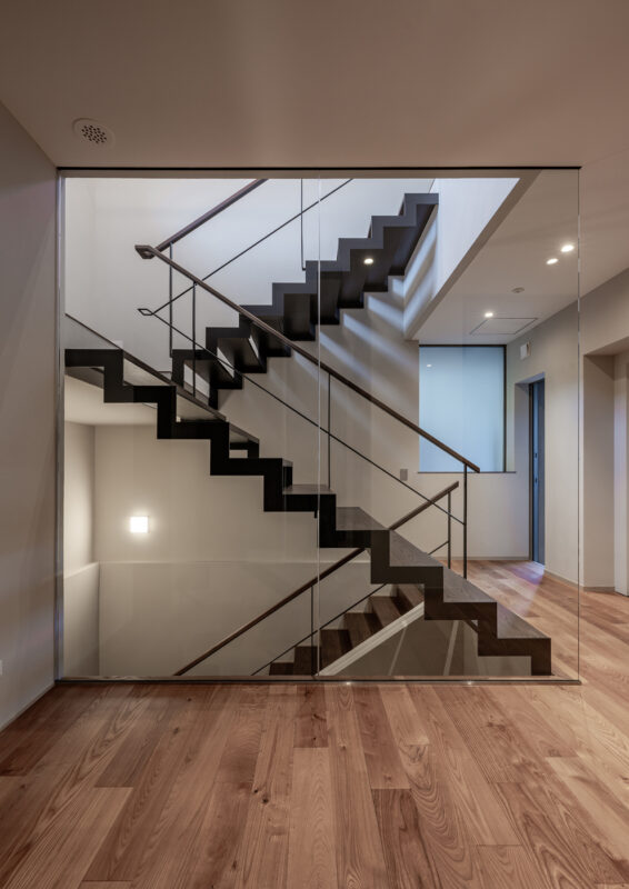 ガラススクリーンによって空間から切り取られた、鉄骨と木を組み合わせたオープン階段。軽快なスチールの構成と温かみのある無垢材の踏面が一体となり、構造体そのものが意匠として立ち上がる。透明な間仕切りにより視線と光を遮ることなく、上下階をつなぐ動線を内部空間の象徴的な要素として際立たせている。
