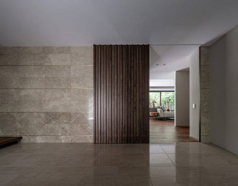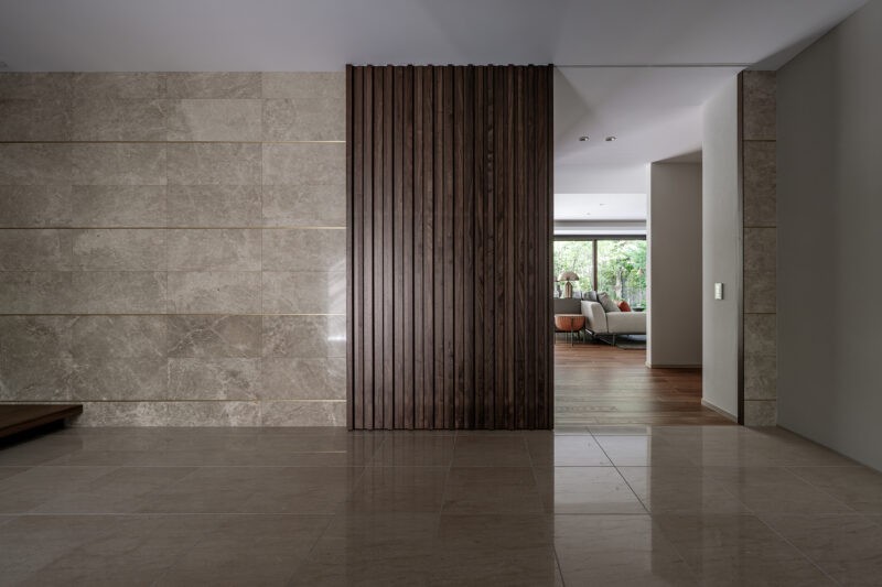 床・壁の大理石とウォールナット製吊り建具によって構成された、静謐なエントランス空間。素材の切り替えによる明確な境界が来客を迎え入れる「間」を生み、奥に続く居住空間への期待感を高めている。視線の抜けをコントロールしつつ、床・壁・天井の連続性によって、住まい全体の品位と落ち着きを象徴する導入部として計画されている。