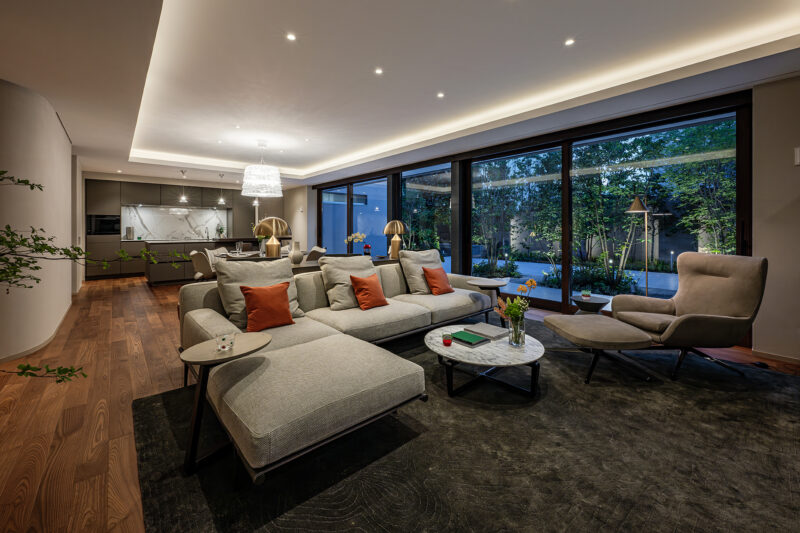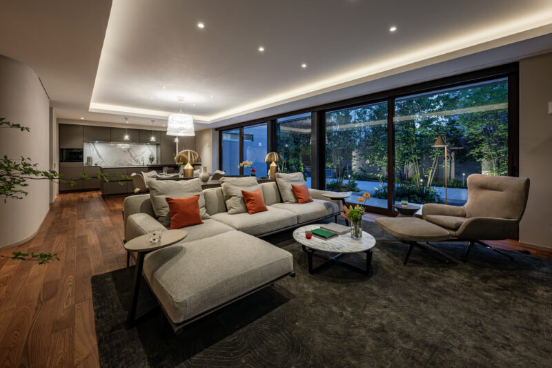 庭に面した大開口サッシが連続する、伸びやかなLDK空間。照明が室内の輪郭をやわらかく際立たせ、昼夜で異なる表情を生み出す。リビングからダイニング、キッチンへと視線と動線が自然につながり、外部の緑景を取り込みながら、開放性と落ち着きを両立させている。