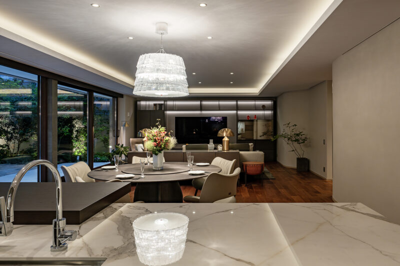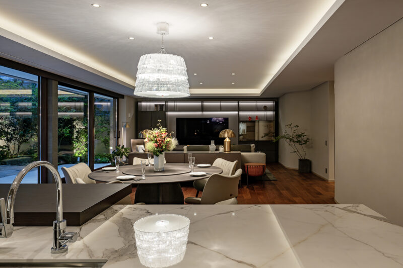 一体化したオープンプランのLDK。天井周囲の間接照明と中央のペンダント照明がレイヤー状の光環境をつくり、時間帯に応じた表情を与える。石調カウンターと木床の対比が上質感を強調し、奥行き方向に連続する視線が空間の広がりと落ち着きを両立させている。
