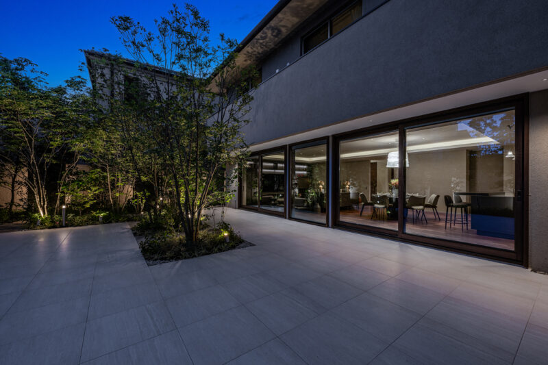 夕景の中庭。連続する大開口ガラスが室内の活動を柔らかく外部へにじませ、建築と庭が一体となった夜の風景をつくり出す。軒天井が光を受け止め、内部の温度感と外部の静けさを対比させながら、住まいの奥行きと品格を際立たせている。