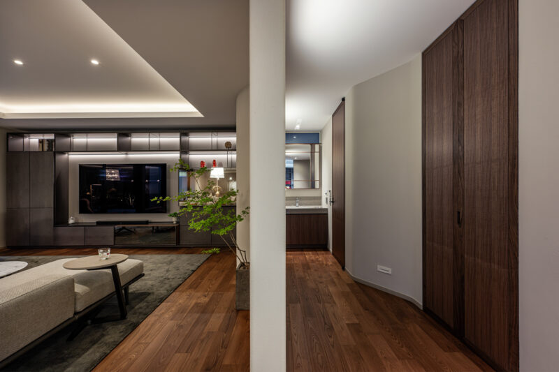 リビング空間と動線スペースを緩やかに分節する構成。Rを描く壁を起点に、視線は奥の造作収納へと連なり、回遊性のあるプランニングが住空間に奥行きを与えている。曲面壁と木製建具が柔らかで落ち着いた印象を添え、間接照明によって機能的な通路でありながらも居室と一体化した上質な内部空間を形成している。