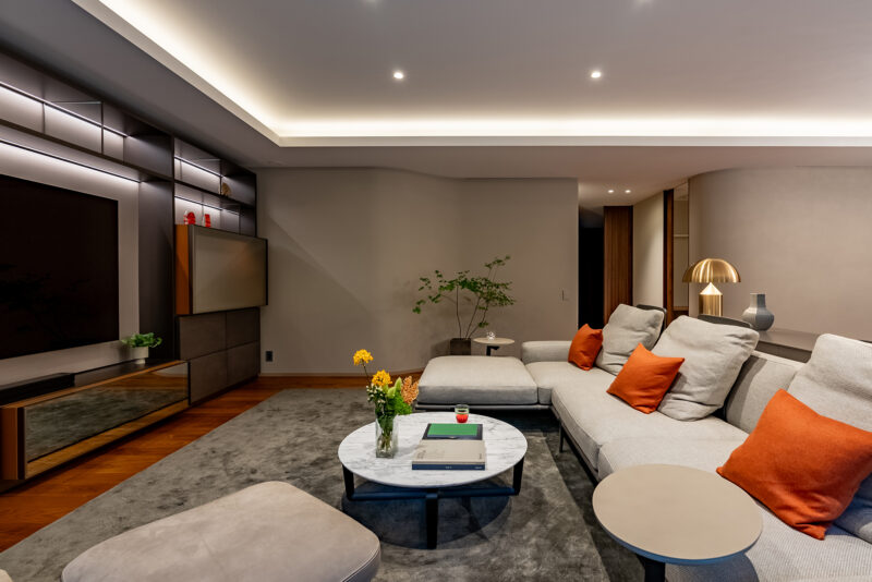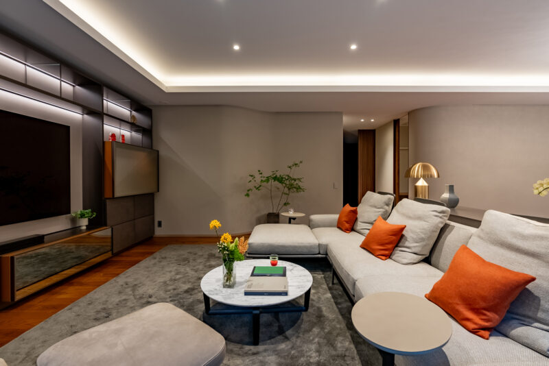 折り上げ天井に仕込まれた間接照明が空間全体を包み込む、落ち着いたリビングルーム。壁面収納が水平ラインを強調し、視覚的なノイズを抑えている。柔らかなファブリックと無垢フローリング、アクセントカラーのクッションが調和し、機能性と居心地の良さを兼ね備えた居住空間を形成している。
