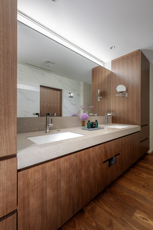 ウォールナット材とシーザーストーンで構成された洗面化粧台。一面鏡とハイサイド窓からの採光により明るくすっきりした印象に。2ボウルにより機能性を高めつつ、素材感とディテールを抑制することで、飽きのこない上質な空間を実現している。
