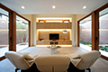 リビングダイニングの壁には、マグマが冷えて固まり生成された火山岩を使用。リビングからダイニングを通って水廻りまで、ALLオリジナルの木製サッシと火山岩の壁が交互に配列された空間構成となっている。TVボードは壁の一部が飛び出たようなデザインに。リビングルームは壁内に納められた吊り戸によって仕切ることも可能。