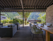 ダイニングキッチンは大きく吹抜けた空間で、縦に伸びる石の壁が2階に設けたライブラリーとのつながりを強調する役割を果たしています。また、アウトダイニングや中庭ともつながっており、とても開放的なエリアとなりました。