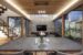 キッチンからみたリビングダイニング。3連のペンダントライトはセードがコンクリートでつくられたインテリア性の高いものをチョイス。木をふんだんに使用したぬくもりのある空間だが、壁に貼られた無彩色のタイルやセラミック天板のキッチン、前述のライトなどによってクールな印象を加えている。